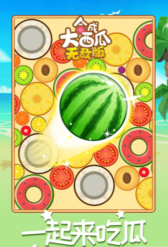 水果碰撞有玄机,合成西瓜靠手艺,玩家拖动相同水果合成更大水果,终极目标是合成大西瓜,水果堆至顶部则游戏失败,水果合成依赖真实物理碰撞机制,弹性,惯性等设定让每一次合成都充满变数,搭配清脆的合成音效和果汁飞溅特效,感官体验丰富,还支持更换水果皮肤和背景主题,每局游玩有新意,休闲娱乐更尽兴。