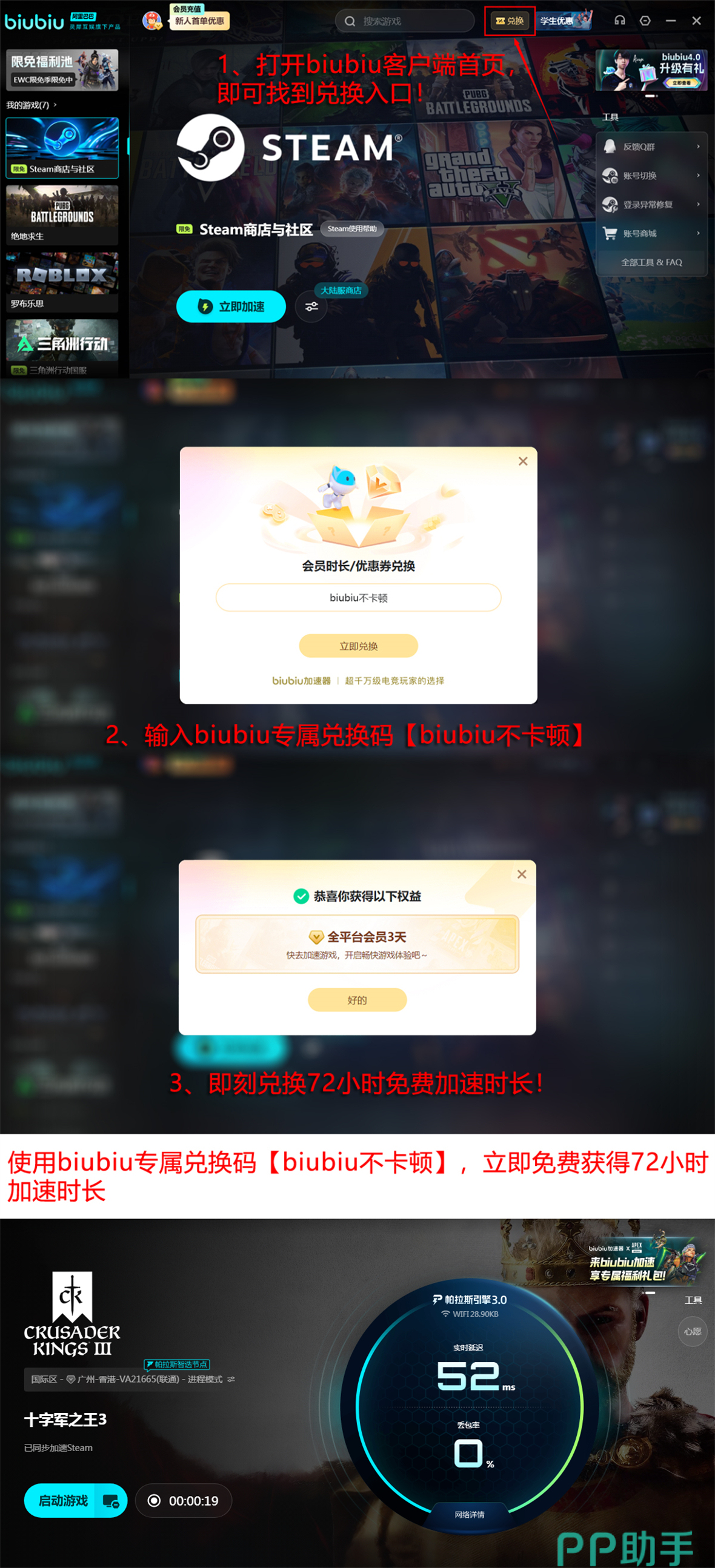 当前biubiu加速器面向新用户提供专属福利:注册即赠24小时免费加速时长;另附通用兑换码【biubiu不卡顿】,单账号限用一次,可额外激活72小时加速服务。两者叠加可获得总计96小时无门槛使用权益,覆盖完整新手适应周期。