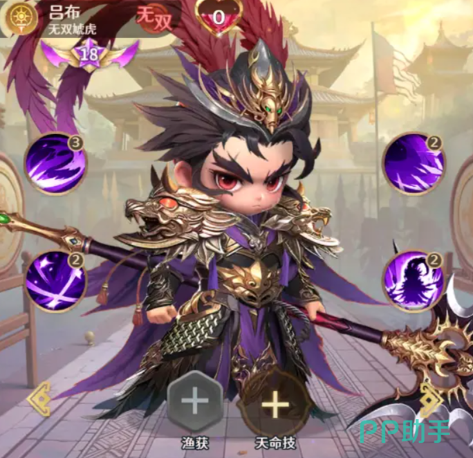 主C吕布具备三重高威胁技能:“乱舞”对敌方全体造成100%物理伤害,并附加减治疗效果;当敌方存活单位≤3时,伤害倍率提升25%,仅剩1人时再额外提升17%,且可直接斩杀生命值低于10%的目标;“崩城”造成121%物理伤害并施加禁止复活效果;“无双飞将”则在敌方每有1名角色阵亡时,为其自身叠加攻击、防御与抗控增益,并回复生命值。