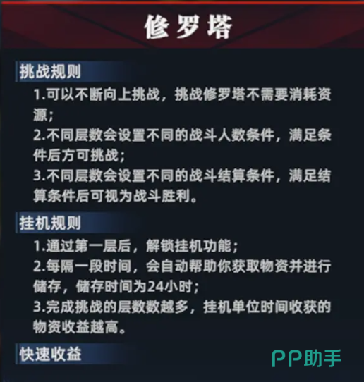 在通关第1层之后就会解锁挂机功能,这就是修罗深渊的懒人福利。系统每相隔一段时间就会自动的收集物资,并且储存物资,最长可以储存24小时。哪怕是离线的状态,都不会耽误收益,而且通关的层数越多,单位时间内会拥有更多的挂机收益。越是往后,那在拿材料的时候就会比较轻松,如果急需资源提提升角色,还可以使用快速收益功能,可以消耗少量的道具,马上获得120分钟的挂机收益。并不需要等待慢吞吞的挂机时长,效率就可以直接提升,而且每天还有一次使用的机会,不要浪费。