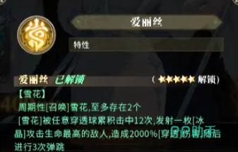 爱丽丝召唤的雪花可同时存在最多2个,当任一雪花被穿透型弹射物累计命中达12次后,将触发冰晶爆发,对当前生命值最高的敌人造成2000%穿透伤害,并进行三次弹跳,专精于单体高威胁目标的快速压制。