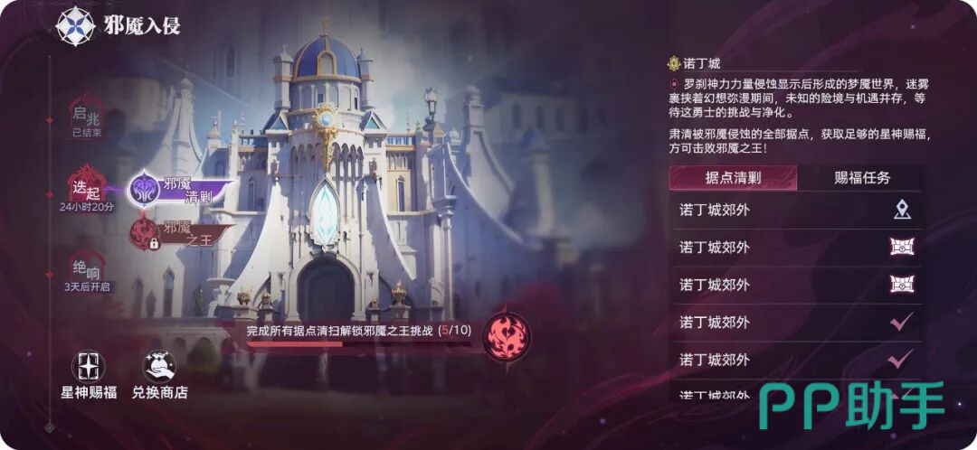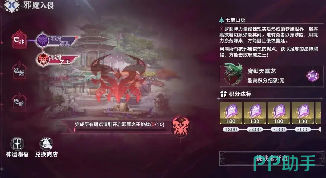邪魇清剿:各阶段开启后,10个邪魇单位将随机分布于玩家已探索完成的大陆地图中。该环节不消耗体力与道具,支持无限次尝试;若战斗失败,可使用指定道具复活2次。成功清除单个据点后,可二选一领取奖励:少量“异梦晶核”或2个“神遗赐福”。