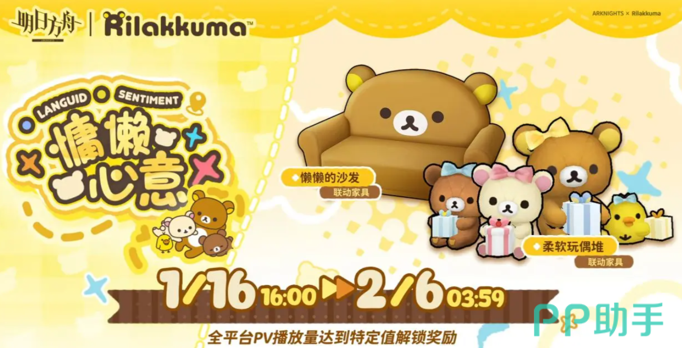 明日方舟×轻松小熊联动活动将于1月16日正式开启,持续至2月6日。本次合作以“慵懒治愈”为主题,为玩家带来一系列限定道具、家具与时装内容,是开年备受关注的跨界企划之一。