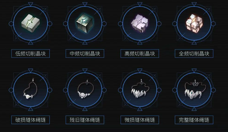 武器突破所需材料包括破损隧体绳链、低频切削晶块、中频切削晶块、微损隧体绳链以及完整隧体绳链,具体数量与阶段对应关系详见下图所示。