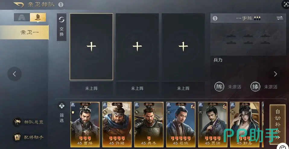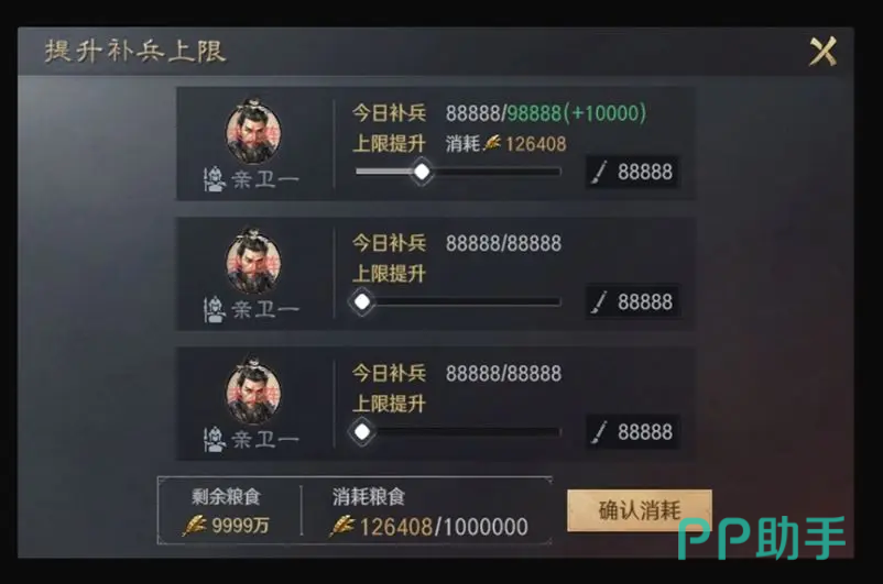 上阵武将数量随“扩营”科技等级提升而增加。部队间武将置换仅限亲卫部队内部进行,禁止与主城部队武将互换;置换操作将同步转移对应兵力数值。驻扎于城外的亲卫武将,其战法配置与装备状态均锁定,出征后无法重置战法或卸载装备。部队具备定时自动补兵能力,补兵速率受当前兵力差值影响:当多支亲卫武将剩余兵力不一致时,系统优先补充兵力最低者;可通过额外消耗粮食提升单支部队补兵上限。