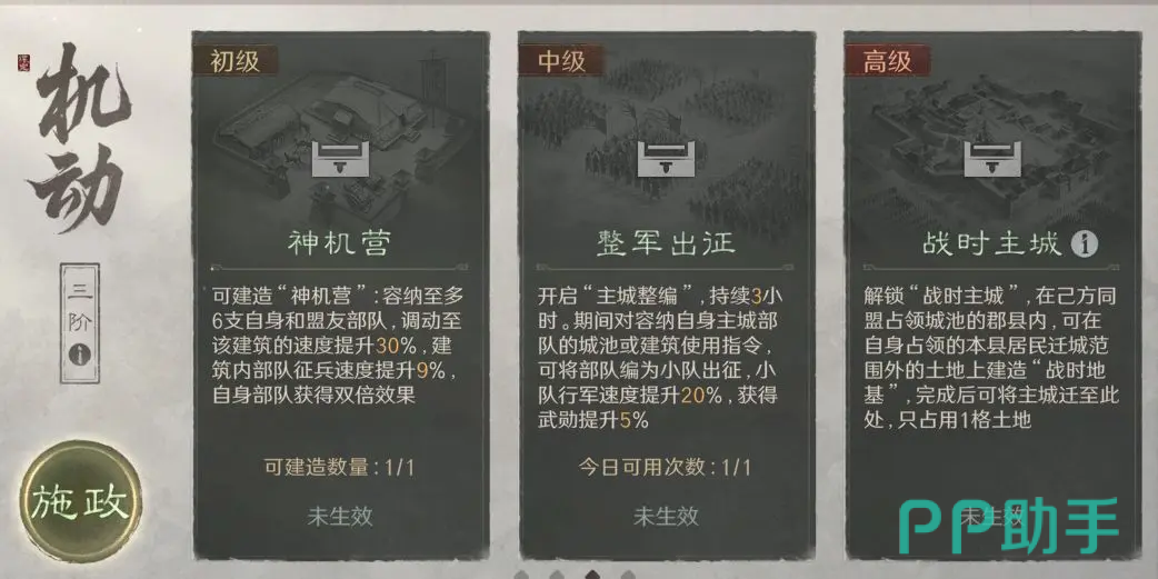 赛季开启即自动激活方略功能,共设务农、机动、富国、戎机四类基础方向。所有方略效果随开服天数线性成长,无固定衰减周期。方略生效存在三级时效机制:初级方案即时触发;中级方案需等待24小时;高级方案则需48小时完成部署。初始仅可启用1项方略,此后每完成一次中心州结算,额外解锁1次选择权,赛季内最多并行激活3种不同类别方略,且不可重复选取。各类型方略独立计时,互不干扰;已选方略支持重置,但需经历72小时冷却期。