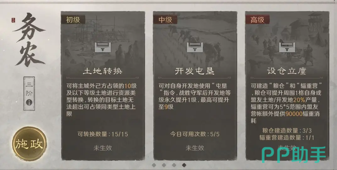 开荒阶段建议优先配置“务农”方略。第一阶段聚焦土地属性转化,通过精准识别资源克制关系实施战略攻占,再执行地块转换操作,其中石料资源应列为最高优先级转换目标;第二阶段可集中资源将8级开发土地升级至9级,此为提升初期资源产出效率的关键操作节点。