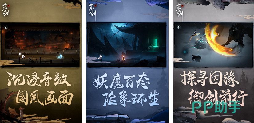 末剑二呈现的是一个充满动荡的江湖,被镇守的妖魔重新出现,玩家将会扮演侠客,利用自己的能力攻击怪物,场景里会设定非常黑暗的大世界,要利用角色的招式和各种剑法展开攻击,每次挑战都会设定一个横屏场景,需要操控角色不断向前攻击这些妖魔,随着前进可以走到镇妖塔内部,击败这些妖魔首领之后,就能让江湖重回和平,挑战过程中会有非常沉浸的音效和暗黑风格的国风画面,可以在游戏里开启一场御剑对战。