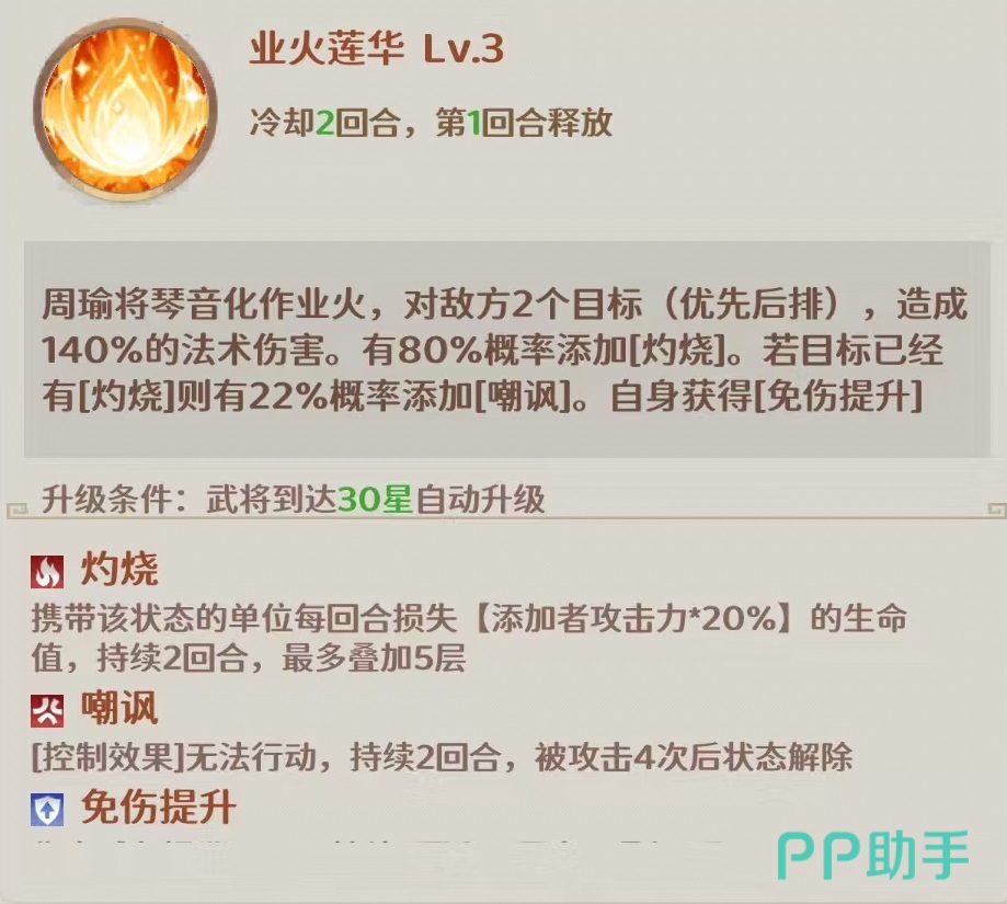 灼烧为游戏中关键持续伤害状态,每层造成施法者攻击力20%的真实伤害,最多叠加5层,多层叠加后总伤害量显著提升。嘲讽则强制目标跳过行动阶段,持续至被攻击四次后解除,属强控手段。免伤增益提供10%伤害减免,可叠加三层,有效提升周瑜在前中期的生存容错率。大招为全体法术攻击,除基础伤害外,每层灼烧可额外提升10%暴击率(上限30%);若目标同时处于嘲讽状态,则本次攻击暴击伤害再提升40%。两项被动分别为:战斗开始时90%概率对随机敌方施加灼烧;回合结束时对随机目标造成真实伤害;进入战斗后即提升自身输出能力。