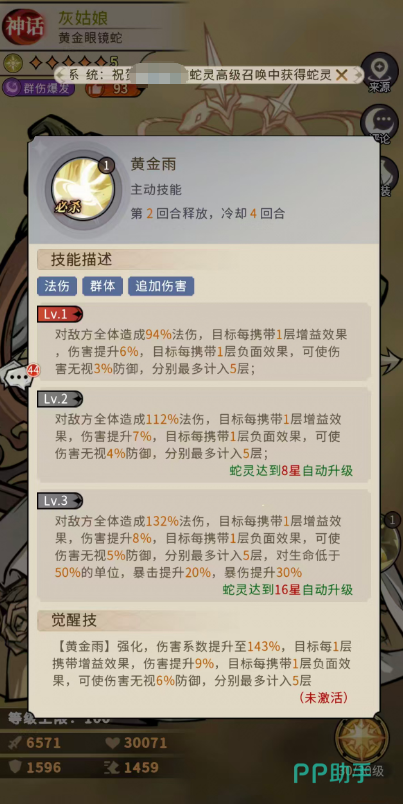 另外的黄金雨是灰姑娘的必杀技,也是主动释放的时候可以利用法伤来追加伤害的群体技能,可以对敌方的全体敌人都造成94%法伤,且此时如果对面敌人身上有携带1层增益效果的话,这里每一层的伤害都会提升6%,而目标每次携带了1层负面效果的情况下,就可以使伤害无视3%的防御数值,所以在上面可以分别最多计入5层,而蛇灵达到8星自动升级的时候就可以一次性对敌方全体造成112%法伤,而在目标每携带了1层增益效果的情况下,这里的伤害提升7%,目标每携带1层负面效果,可使伤害无视4%防御,分别最多计入5层,蛇灵达到16星升级的时候就可以对敌方全体造成132%法伤,且目标每携带1层增益效果的时候,其中的伤害会提升8%。