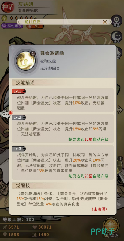 灰姑娘的最后一个技能就是舞会邀请函,这是灰姑娘的被动技能,战斗开始时,可以根据当前的站位为自己以及处于同一排或同一列的队友带来【舞会星光】的状态,此时提升的就是10%的攻击,就算对面有净化类型的技能也是无法进行驱散的,而在蛇灵达到12星的时候,这里就会升级为战斗一开始的时候,为自己和处于同一排或同一列的友方角色带来15%攻击和5%闪避提升,后期最高是达到20星同样是给友方单位附加【舞会星光】,但是此时这个状态带来的提升数值就达到了20%攻击和10%闪避,而且大家在攻击时,还有额外会造成携带【舞会星光】单位数量3%攻击的真实伤害。