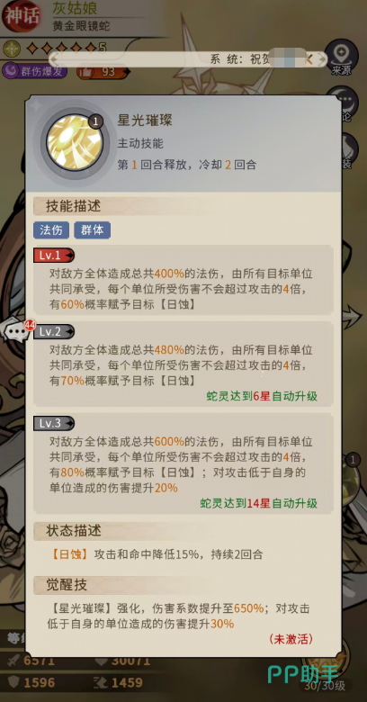 星光璀璨是灰姑娘的主动技能,可以带来足够的法伤,也是针对群体释放最频繁的一个技能,使用的时候可以造成敌方全体总共400%的法伤,其中的每个敌人所受伤害不会超过攻击的4倍,同时还有有60%概率赋予目标【日蚀】,要是蛇灵达到6星自动升级对敌方全体造成总共480%的法伤,同样这里的伤害是由群体来一起承受的,而且每个角色还是所受伤害不会超过攻击的4倍,但是这时是有有70%概率赋予敌人【日蚀】的影响,在蛇灵达到14星自动升级对敌方全体造成总共600%的法伤,还有80%概率可以带来【日蚀】的叠加,其中对攻击低于自身的单位造成的伤害数值会有20%的提升,如果是日蚀攻击和命中降低15%的情况下,其中的觉醒技星光璀璨会获得强化,而伤害数值会提升到650%,对于攻击低于自身的目标会造成的伤害则是可以提升30%。