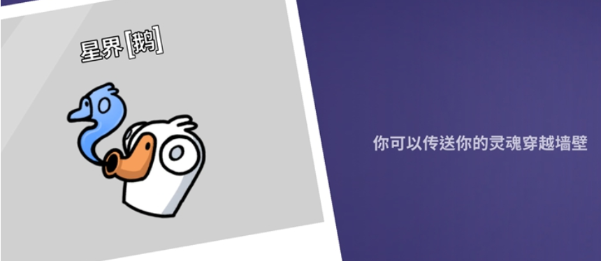 星界鹅:释放灵魂进行穿墙探查,本体静止不动,灵魂可无视障碍物移动并监听周围语音。受限于无法识别角色颜色与外观,需依赖动作节奏、停留时长、对话内容等细节交叉印证。适用于伏击预警、会议前情报收集及多人行为模式比对,属于高阶信息挖掘型身份。