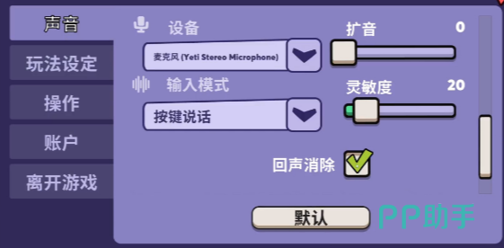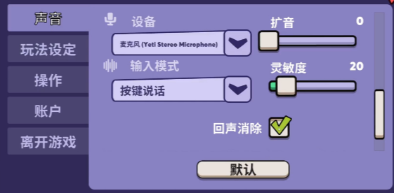 由于这是一款社交性质比较强的游戏,并且需要通过开麦交流的方式来玩,所以除了按键方面的设置之外,你还可以在声音这个选项里面看到自己的发言方式。一般来说有自由发言和按键说话这两个选项。小编比较推荐大家选择按键说话,等到需要发言的时候按下确定键即可。如果说你想让自己的声音更亮一些,方便队友听到,那么还可以通过扩音来进行调整。