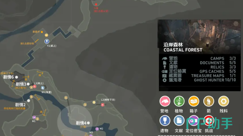 失落探险家古墓的位置位于沿岸森林附近,具体的位置,小编已经在图片中为大家标注出来了,各位小伙伴跟着剧情顺序直接前往即可。如果说实在找不到的话也没关系,当你靠近古墓附近的时候,系统也会在左下角给你发送一个比较明显的提示消息,跟着系统的提示走就可以找到。失落探险家古墓的入口是一个不太明显的洞穴,在进去之后小伙伴们需要先左拐,然后看到一块木板,通过这块木板,你可以继续往上爬,一直爬到第2层石阶为止。