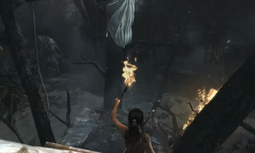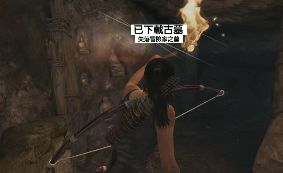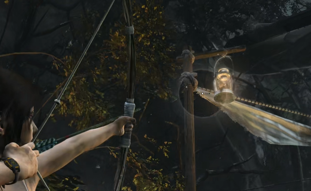 此时你的眼前会出现三个灯笼,需要把它们给捡起来,然后再往前扔,在灯笼的照耀下,你可以看到前方有两个木桩,上面裹着布条。翻过去之后可以看到在另一面有着一个尸体,他的头上悬挂着一个灯笼,你需要用弓箭把这个灯笼给射下来,然后灯笼中的火种就会把底下的柱子给点燃。接下来走到柱子面前,把它给推倒,让它一路去点燃其他的柱子。