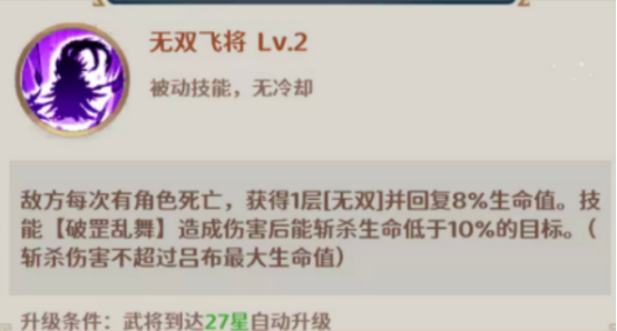 还其次还要了解的就是吕布的绝学,尤其是在战场当中的爆发输出或者是战场的统治力非常卓越,尤其是在斩杀或者是强化机制方面表现得非常卓越,经常会采取阵亡以及无双状态巧妙叠加,提升自身的属性,在战场上的作战能力相对来说非常长,并不会三下五除二被敌方打败。