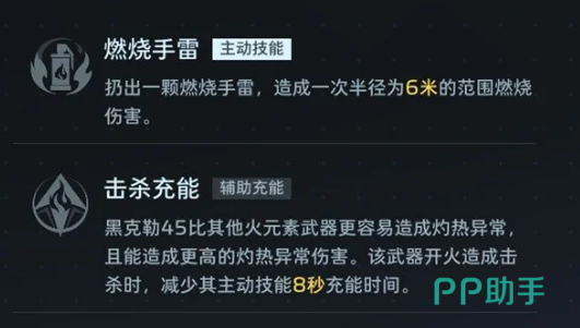 视觉重心处的蓝白渐变色材质,让每一次的推枪,还有更换子弹都能看到标志性的舞台色彩。战斗的一瞬间也会拥有较强的仪式感,颜值之外,它的实战性能更成为开荒的利器。作为一把冲锋枪,这一把枪短小精悍,更换子弹的速度是比较快的,而且还会拥有卓越的机动性能。主动技能燃烧手雷就可以造成6米半径内的范围性伤害,可以轻松的清理群怪。更贴心的是击杀敌人还能减少8秒的技能充能时间。搭配本身就会拥有的灼热异常伤害,在猎场刷钱的速度就可以直接提升。