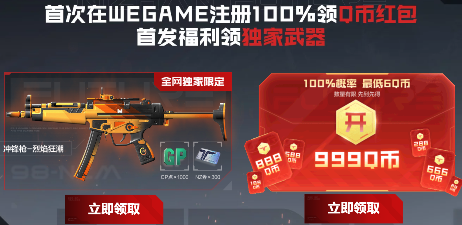 游戏中除了给玩家准备了充值返利的活动以外,还准备了其他比较丰厚的活动呢,手心就时玩家们只要时第一次在wegame上注册账号的玩家就100%的能够领取到qb红包以及独家武器烈焰狂潮,注册的账号只要到了1级就能够领取到和三角洲联动的奖励逆战未来突击步枪的外观。