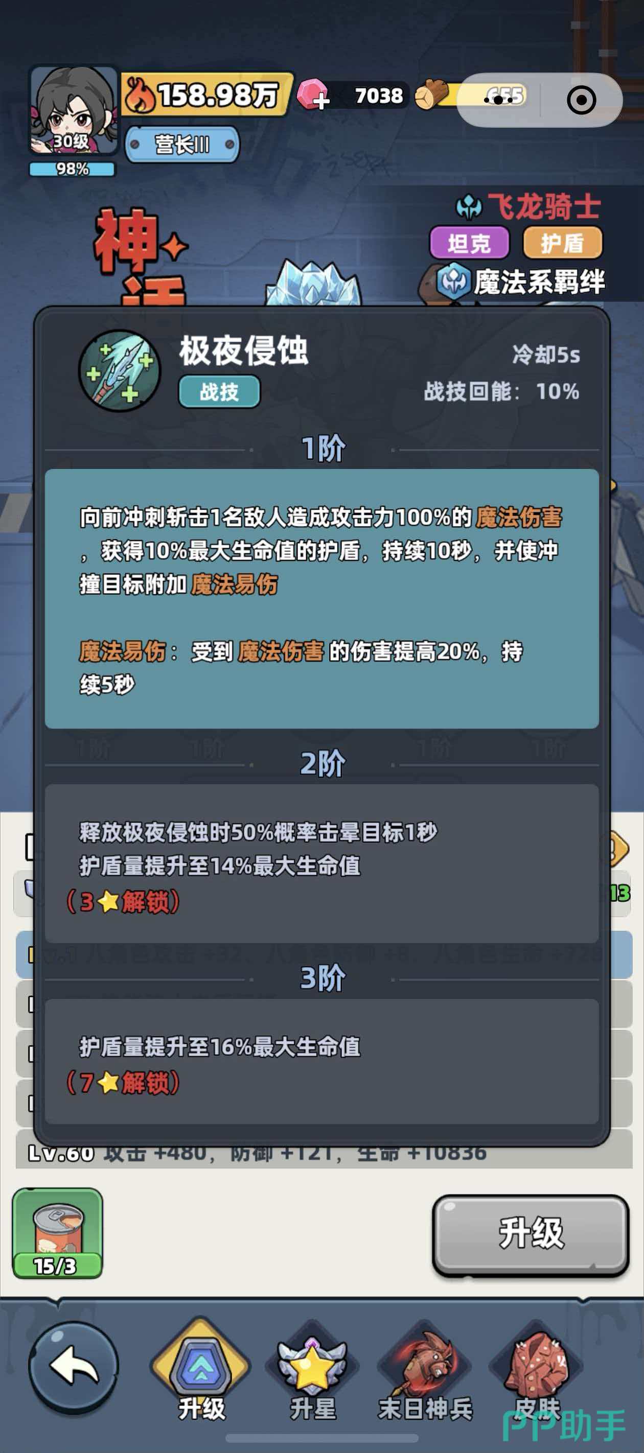 战斗技能极夜侵蚀,在1阶的时候,飞龙骑士向前冲可对1名敌人发起斩击,能够造成攻击力100%的魔法伤害,还会获得10%的最大生命值护盾,护盾能够持续10秒钟的时间,同时还会给敌人附加上魔法增伤的效果,一旦地敌人被附加上魔法增伤,那敌人在受到魔法伤害时,伤害会提升20%,可以持续5秒钟的时间,技能在2阶的时候使用极夜侵蚀时有50%的几率将目标给击晕1秒钟,护盾量则升级为14%的最大生命值,3阶混沌量会提升到16%的最大生命值。