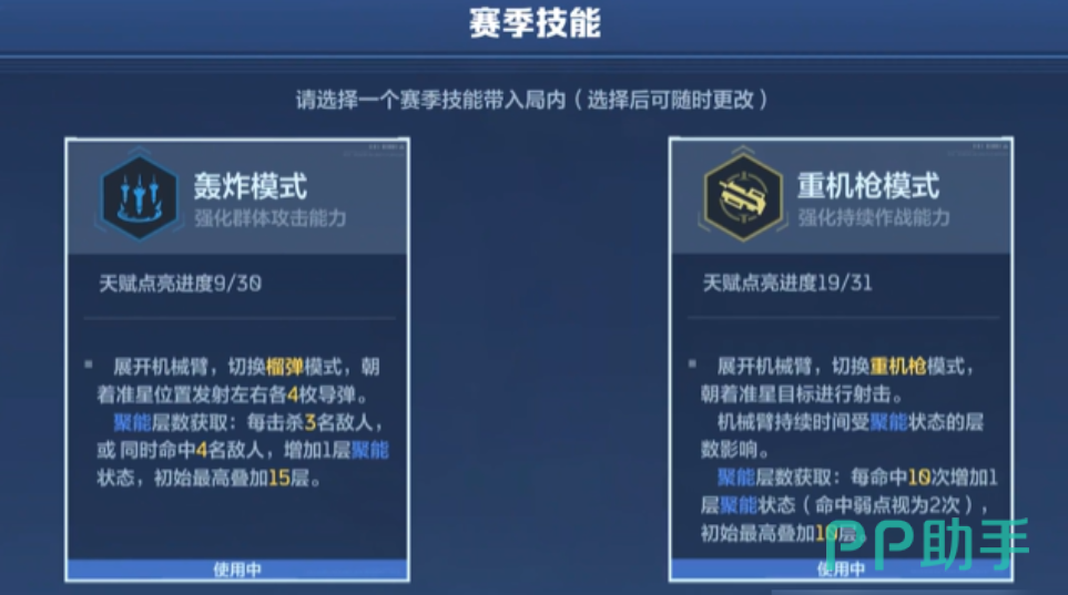 以上就是逆战未来赛季天赋技能选择的全部内容, 大家在选择赛季天赋技能的时候,可以根据自己当前应对的情况来进行评定选择,比如说遇到的敌人比较多的时候,哪玩家就可以携带轰炸模式,这样可以对群体对手展开快速的射击,若是需要持续性的战斗就立刻更改为重机枪模式。