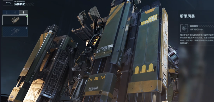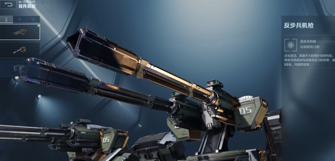 机甲的挂载也很关键,合理的搭配才能最大化战斗力。1号位置选择挂载手推反步兵机枪。但由于核心的位置选择电磁轨道炮,在PVP的模式中,就基本上使用不到这一个挂载。这一个挂载更适合在PVE模式中发挥作用,在副本中面对大量的小怪时,反步兵机枪就可以带来持续的范围性伤害。2号位的选择也很重要,这里建议直接选择等离子护盾。等离子护盾可以主动的投掷,在部署之后可以给自己提供防护,有效抵御敌方的子弹,不会影响到正常的攻击操作,实用性比较出色。