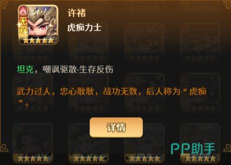 角色立绘采用赤膊上身设计,凸显其悍勇无匹的视觉风格。在策略类手游常见定位中,许褚虽属前排坦系,但相较传统纯防御型武将,其技能组兼顾可观输出与战术功能性,实现“能扛能打”的复合型作战定位。