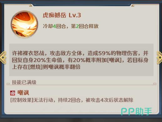 终极技能“虎痴撼岳”为全体范围攻击:虽基础倍率中等,但可恢复自身20%最大生命值,并有20%概率使目标陷入嘲讽状态;若目标已处于燃烧状态,则嘲讽触发概率提升至40%。游戏中嘲讽效果持续2回合,且需被攻击满4次方可解除,具备稳定控场价值。
