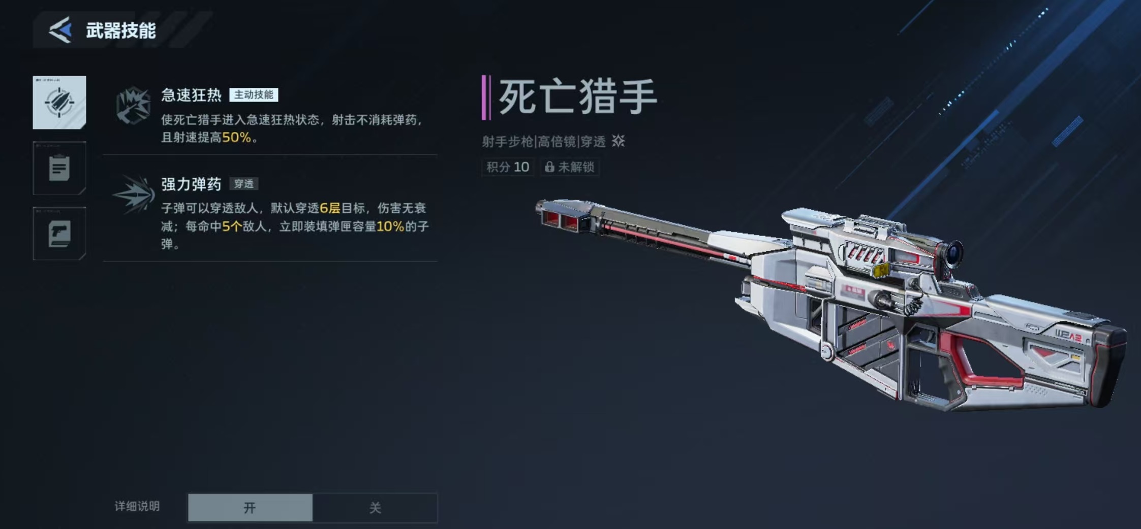 该武器拥有两项主动技能: 第一技能【急速狂热】——开启后射击不消耗弹药,射速提升50%,适用于短时爆发压制; 第二技能【强力弹药】——强化子弹穿透属性,维持6层穿透上限及零伤害衰减特性。