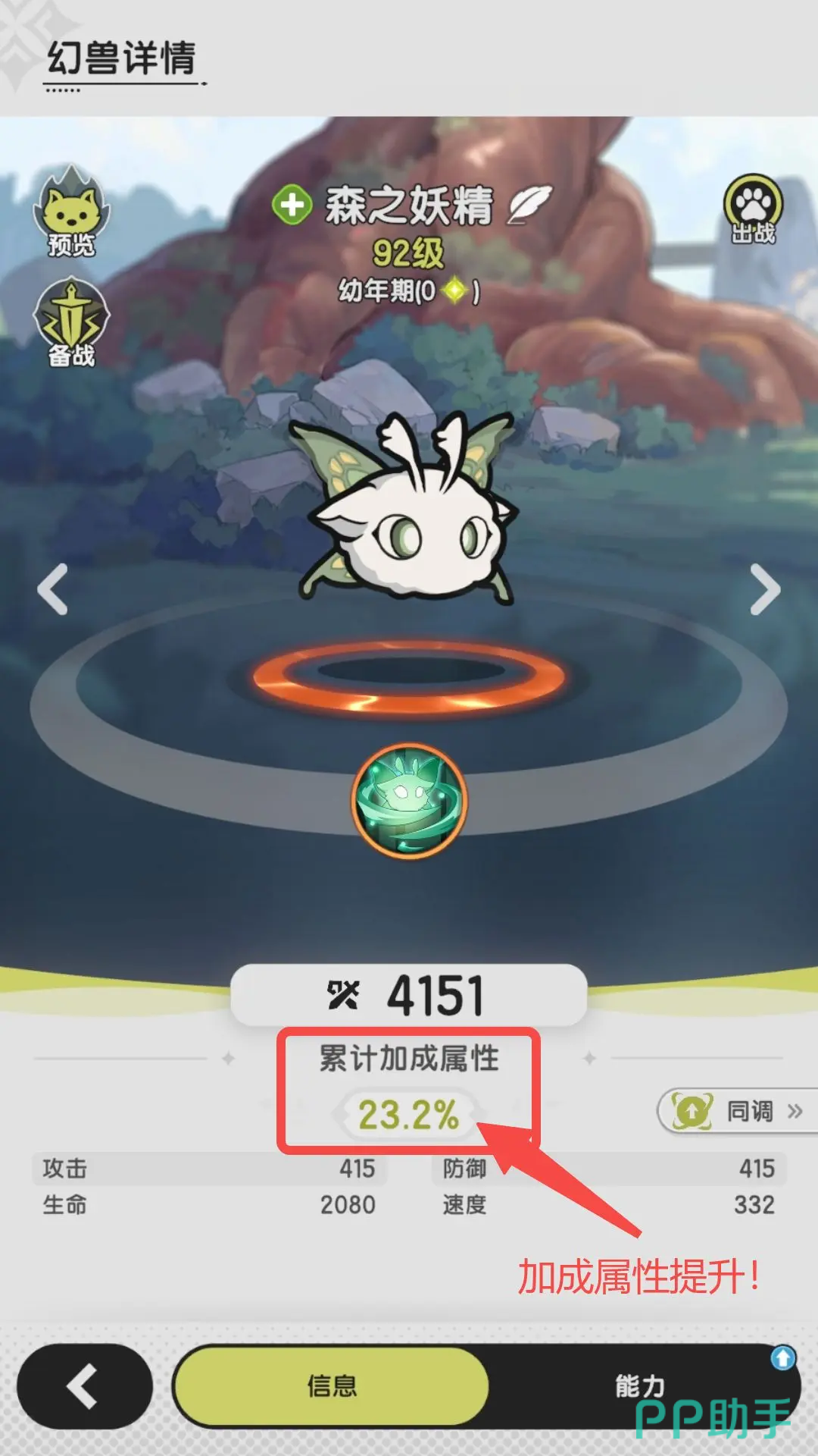 操作路径清晰直观:进入幻兽养成界面后,页面右下角将显示“同调”功能按钮;点击进入专属同调面板,即可选择目标幻兽并执行同调操作。每次同调成功,均会提升该幻兽的基础属性加成系数,原有累积数值随之动态上浮。同调等级越高,所需幻兽碎片数量越多,对应属性增幅也越显著。