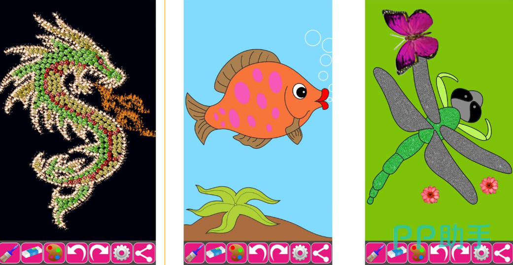 本作也是为许多小朋友们开发的绘画模拟类小型手游,充满娱乐性的绘画设定让大家快速学会了画画,色彩分明的美术表现也带来了视觉上的享受,充满魔力的绘画流程吸引了许多小朋友的目光,涂鸦的过程节奏极快可快速完成形形色色的任务,操作也很容易让小朋友们学会了如何上色,上千种不同类型的填色模板看上去也是熠熠生辉。