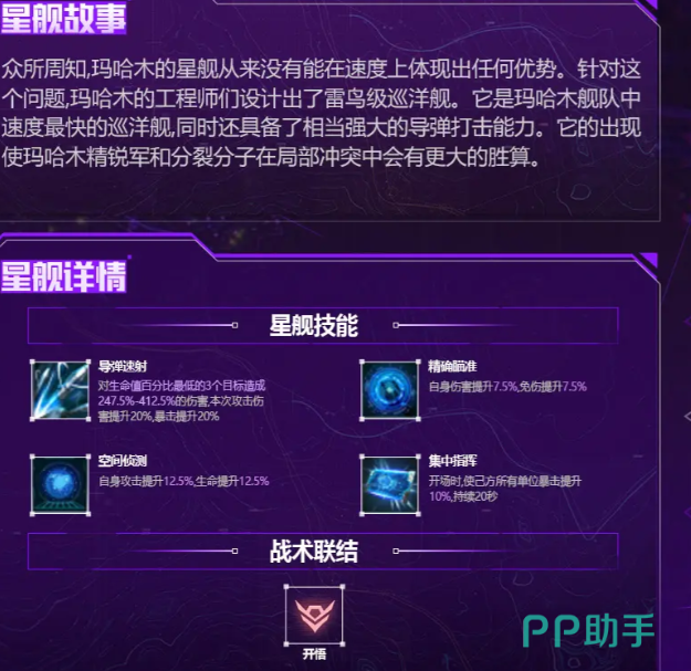 压轴推荐泰坦级战舰「雷鸟」。其突破性地融合庞大规模与高机动性,在战场定位中兼具压制与支援双重职能。首技「导弹射速」锁定敌方血量最低的3个目标,造成伤害并提升自身20%暴击率;二技提供7.5%伤害与7.5%免伤双增益;三技「空间侦测」同步提升12.5%攻击与生命值;终极辅助技可在战斗开场20秒内,为全体友方单位赋予10%暴击率加成。