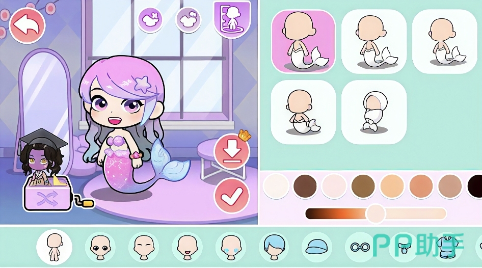 核心玩法聚焦于高自由度环境交互。场景内所有可触达物件均支持实时操作:例如调节彩虹夜明珠的色相与亮度;向魔法池注入不同属性药剂,即时切换角色形态——服用水下转化药剂后,双腿将幻化为鱼尾,适配海底游弋与海洋生物互动;切换陆上形态则需使用对应稳定药剂,恢复人腿结构以便在建筑内部自由行走。该形态转换系统贯穿全部主线与支线流程,构成游戏标志性奇幻体验。