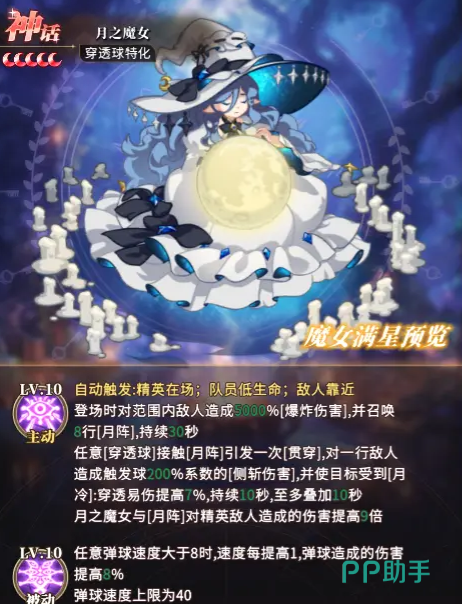 其技能联动机制尤为精妙:当穿透球接触“月震”区域时,自动触发贯穿效果,单列目标将承受200%的触发球基础伤害,且该穿透伤害状态可持续10秒。此外,月之魔女拥有专属被动——弹球速度超过8单位后,每帧累积速度点,最高可叠加至8%的额外伤害增幅。这一设定使其在高速弹道构筑阵容中具备无可撼动的战术优先级。