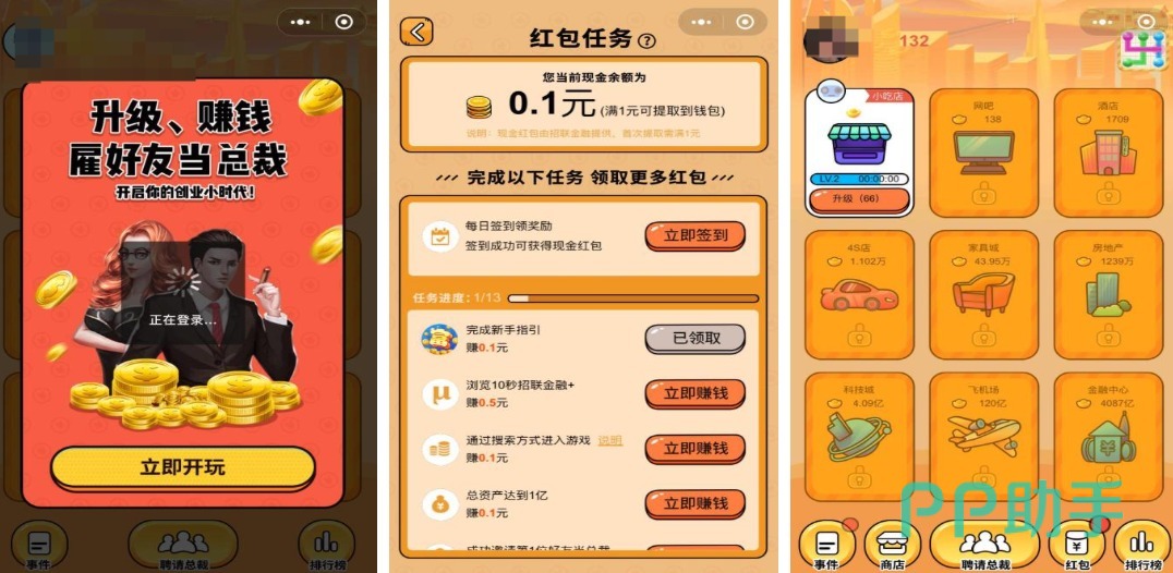 欢迎各位平民小白进入本作感受下赚钱当首富的既视感,这是款拥有多种多样赚钱项目的竖屏操作小游戏,有着大量经营资源可以感受到成为老板的既视感,各类红包任务的加持也会让朋友们快速成为老板,经营门店并尝试招募员工的游戏理念也蛮有意思,意境十足的赚钱过程也是这款经营手游的特色。