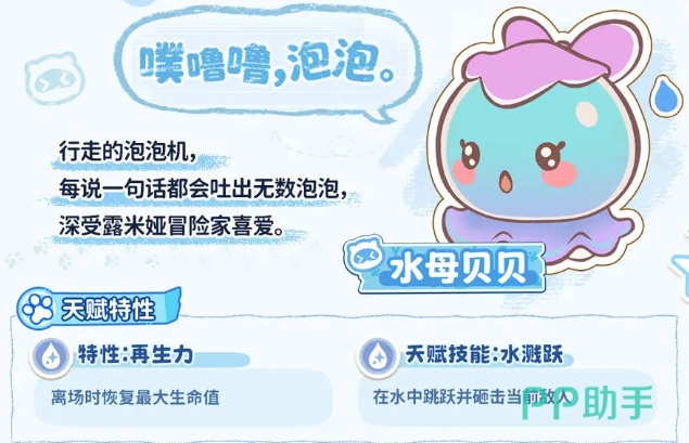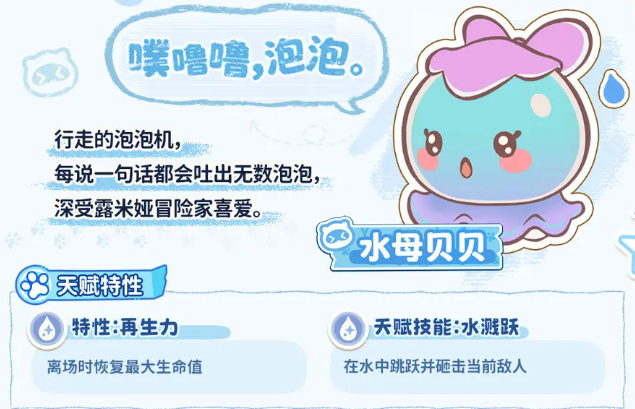 第一个为大家介绍的叫做水母贝贝,水母贝贝在当前的水系宠物里面具有自身独特的效果,大家可以运用它的天赋能力带来水系能力,水母贝贝可以在攻击时带来足够的范围输出,而且这类砸击类型的效果对于对面的如果是直线区域的站位,那么在这里它能够带来的伤害数值是非常高的,特别是如果大家参与的战斗,正好发生的地形是有水域区域的话,那么在这里他在技能的接受伤害上面会有30%的数值可以达到区域提升,这样的元素增强效果也可以让水母贝贝利用自身的水系能力来给敌人带来一部分减速。