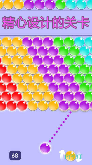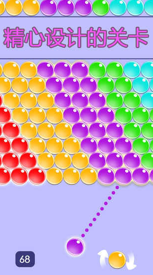 每一关都会出现五颜六色的泡泡,玩家的任务是发射泡泡去完成消除挑战任务。只要是同一种颜色的泡泡碰到一起就可以成功消除,想要拿到更高的分数,玩家需要仔细观察每一关里泡泡的颜色分布,找对角度再发射,这样才能一次性消除更多泡泡。游戏里的道具也可以随时取用不用额外解锁,随着关卡往后推进,泡泡发射的速度会越来越快,我们需要加快手速才可以闯关。