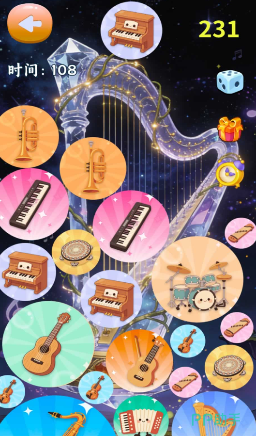 收纳了超过100种乐器模型,小到口琴,大到吉他等,各类乐器的完整谱系都可以在这里找到。关卡的设计比较巧妙,把合成机制和时间挑战完美融合到了一起,游戏过程中,乐器图标会从屏幕正中央随机往下掉落。玩家只需要滑动屏幕,让相同的乐器图标两两相撞,就可以触发升级合成的效果。