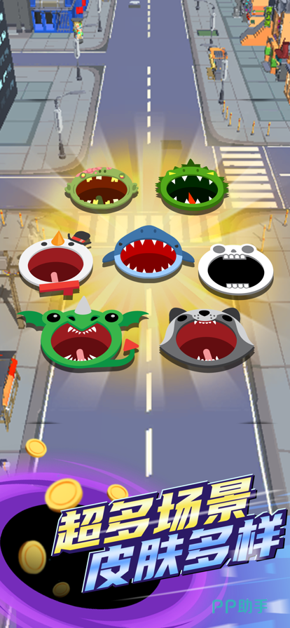 多个黑洞,玩家们将会来一场激烈的黑洞大乱斗竞技多人在联机对战时可同时操控着自己的黑洞,将场景中出现的车辆和相关的物体全都吞噬到自己的身体内,最终的目标是要成为游戏任务中最大的黑洞角色存活到最后。虽然整体采用了2D的画面风格,但是清晰度是很高的,在操控黑洞移动时特别的流畅,不会因为卡顿而阻止黑洞向前移动的步伐。