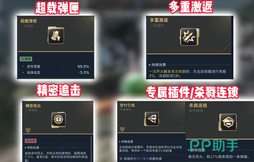 第2个就是通过刷副本而获得的死亡猎手,这把枪的主要特点就在于单发伤害很高,是精准打击型的好选择。插件搭配上可以选择多重激返,精密追击,然后搭配专属的插件以及杀戮连锁。可以避免频繁的更换子弹而影响到输出的节奏,让每一发精准射击都不会浪费。多重击反可以增加子弹的穿透效果,在应对多个敌人时也会比较灵活,还有精密追击,可以提升远距离射击的命中几率。
