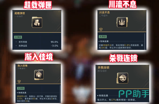 第1个就是雷霆999,作为入门级别的一把枪,主要的特点就是弹夹比较大,不需要更换子弹。这一个特点就能让它在持续输出的场景中拥有更多的优势,针对这一个特点,插件可以选择川流不息,渐入佳境,杀戮连锁。可以有效提升弹夹的容量,让持续输出的能力更上一层楼,还能随着射击的时间延长去提升伤害,拥有越打越疼的特色。