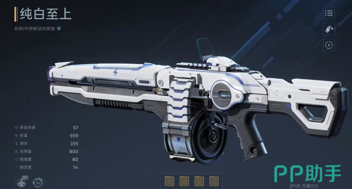 还有一把主武器叫纯白至上,这枪的数据面板看着比雷霆999更漂亮一些,就是换弹时间稍微长了点,不过配合插件也能解决这个毛病。小编感觉它开箱的概率比999低一些,所以放在第二个讲。它的主动技能叫磐石身躯,开启后会有个力场保护,能减少28%的伤害,同时持续射击的话每0.25秒还能叠加8%的增伤效果,最高可以叠到96这个加成就很夸张了。而且触发条件特别简单,基本上战斗过程中都能保持高增伤状态。被动技能强力冲击也很给力,射击的时候射速会慢慢提升,最多能提升100%,本来射速就不慢,现在还能翻倍,打起来手感特别好。