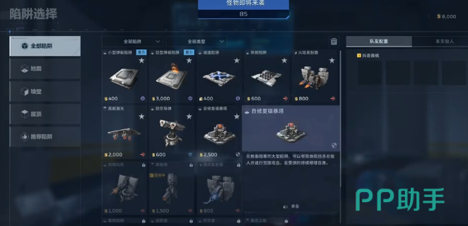 第7关主要就是优化输出的配置,可以把之前的火墙陷阱全部卖掉,然后更换成高能激光。走到右手边出怪口的上面,放置4个高能激光,另外一侧也需要做同样的布置。如果整个过程中陷阱损坏,直接选择补充就行,此时的资金基本上已经充足,不需要担心不够使用。第8关就被称之为挂机局,此时的资金已经累积到77,000左右,在两侧平台上可以放6个88陷阱。没有升满的话,可以全部升级完毕,布置后就可以开启挂机模式,尽情等待下一波敌人的到来。