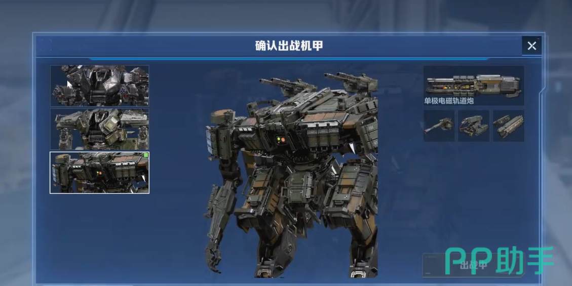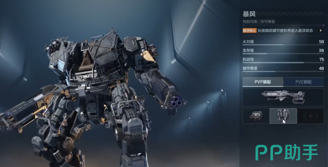 机甲战力并非仅由本体决定,配件系统的深度协同才是核心。界面右侧明确划分PVP与PVE两套独立装配体系,二者不可混用。配件体系分为四大类:主武器、战术挂件、辅助挂件及专属挂件。以暴风机甲为例,其主武器支持三类选择——步枪(单发伤害最高,射速偏低)、冲锋枪(射速最快,单发输出较弱)、机枪(综合平衡型,中等伤害与中等射速)。实际选用需结合个人操作习惯与战场定位进行决策。