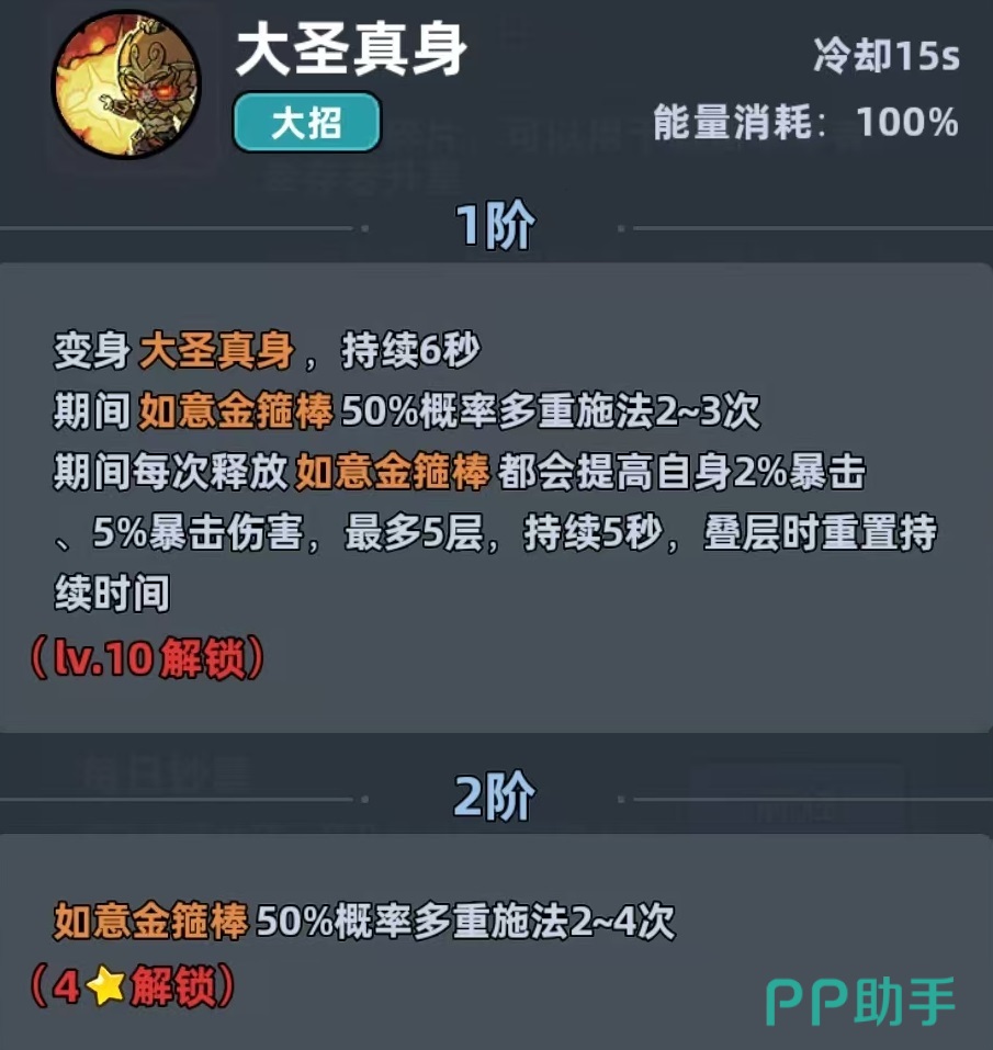 终极技能“大圣真身”是其质变关键:开启后持续6秒,在此期间,如意金箍棒每次触发均有概率进行多重施法(即单次技能可连续打击多次),且每次成功释放均会叠加自身暴击率与暴击伤害,增益效果可叠加,无衰减限制。这一机制使其在PVE推图、精英关卡及PVP对抗中均展现出极强的瞬时清场与破防能力。尤其在角色升至三星后,暴击属性迎来跃升式增长,对高护盾值与高血量Boss具备显著克制效果。属性培养优先级明确:暴击率>暴击伤害>攻击力>最终增伤>攻击速度,全程围绕“暴击+爆发”构建数值模型,攻速并非核心需求。
