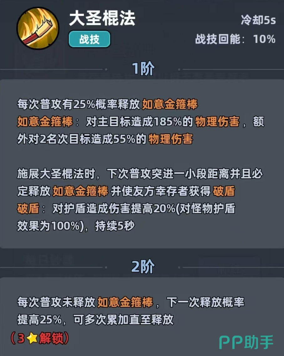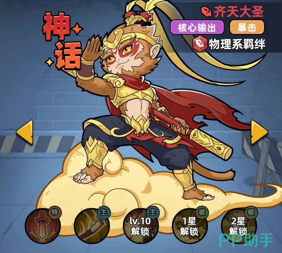 齐天大圣归属于物理系羁绊体系,定位为站桩型主C,核心优势集中于暴击率与暴击伤害的双重成长曲线。其碎片可通过日常钞票副本、基金返还、特权卡奖励等多路径稳定获取,资源门槛较低,养成周期短,适合新手与资源有限的玩家快速成型。主动技能“大圣棍法”具备双重机制:每次普通攻击均有概率触发如意金箍棒,对主目标造成高额物理伤害,并额外对两名相邻敌人施加溅射伤害;同时,在释放该技能后,下一次普攻将附带短距离突进效果,且必定触发如意金箍棒,并为全体友方幸存者赋予“破盾”状态,显著提升团队对护盾型敌人的压制能力。