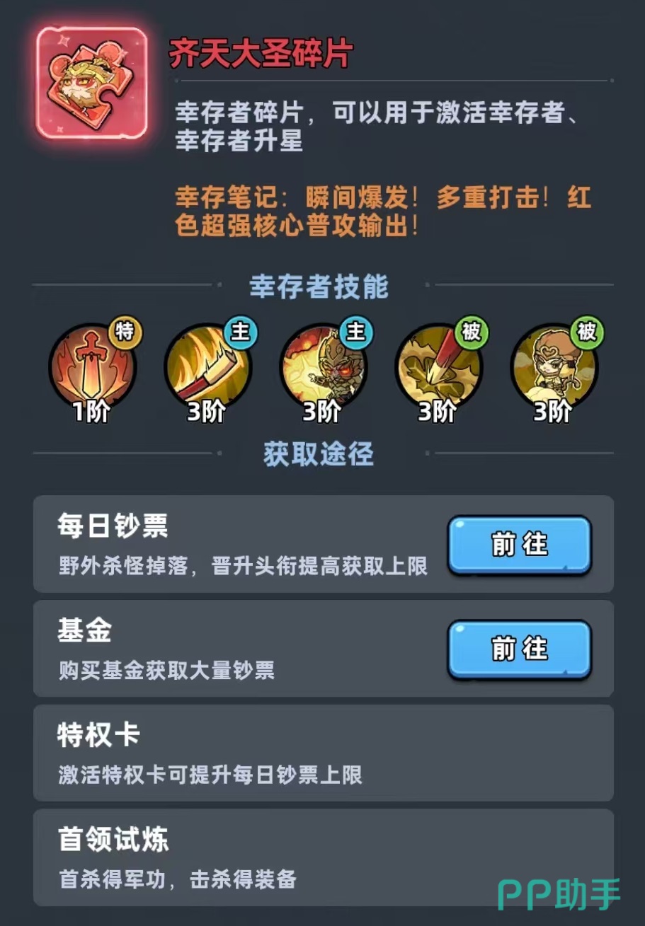 在《生存33天》这款策略生存类手游中,齐天大圣作为神话品质角色,凭借其高爆发、强破盾与泛用性,稳居当前版本T0级物理核心输出之列。本文将围绕其技能机制、养成优先级、阵容适配及实战打法展开深度解析,帮助尚未获取该角色的玩家全面了解其强度定位与培养价值。