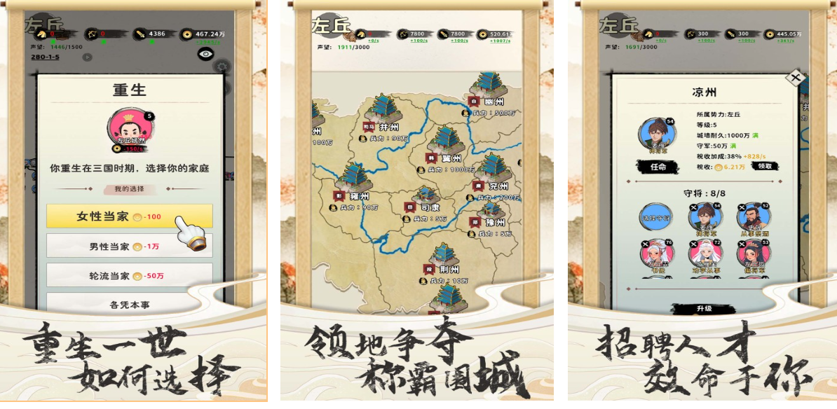 《三国人生》戏给出一个完全开放的人格化三国世界,让玩家从一介草根开始,自由选择投奔诸侯和落草为寇或者自立门户。该作的独特之处就在于它对时间的流逝、随机事件的考虑上,壮年时没有建立功勋的武将,随着武将寿命的减少,角色的体能、智力都会发生动态的变化。玩家在不断结交名士、经营人脉的同时,还会遇到各种影响历史走向的奇遇,需要领兵打仗来积累的声望,吸引更多的流民前来投奔。