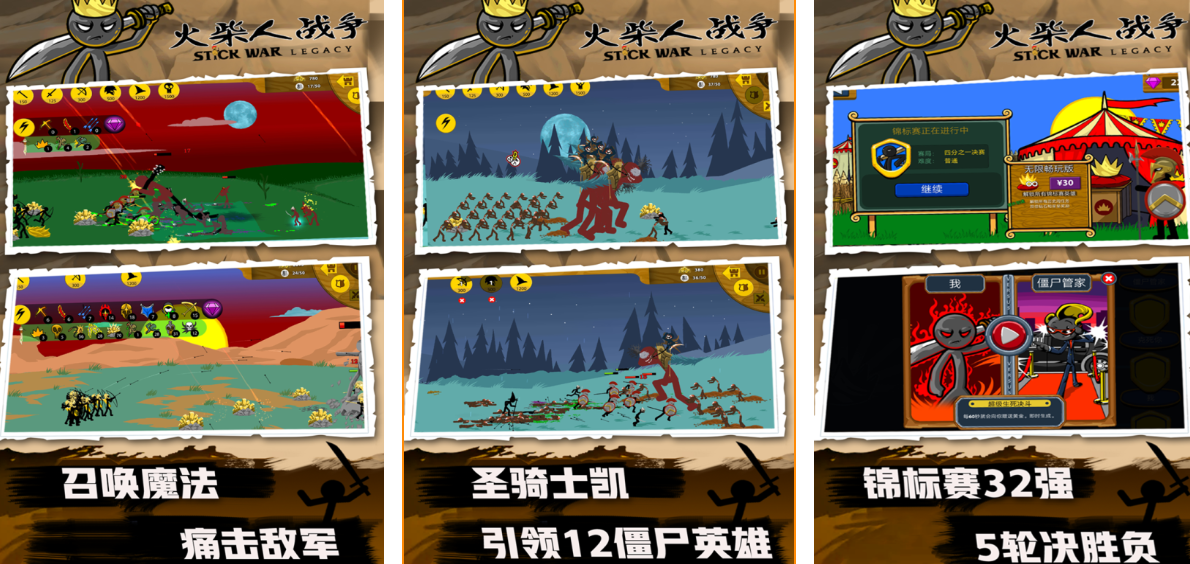 《火柴人战争》游戏的核心竞争力就是它成熟到极致的勋章系统和关卡设计,玩家要带领名为秩序的国家,对抗周围崇拜暴力或者信仰魔法的部落。该作有着丰富的战略模式,其中经典的战役闯关和具有挑战性的无尽丧尸模式最受玩家们的喜爱,玩家们需要在一定的范围内来完成复杂的采集与出兵的搭配。游戏的动作刻画十分细致,士兵的站位和攻击间隔等都很生动表现了出来。