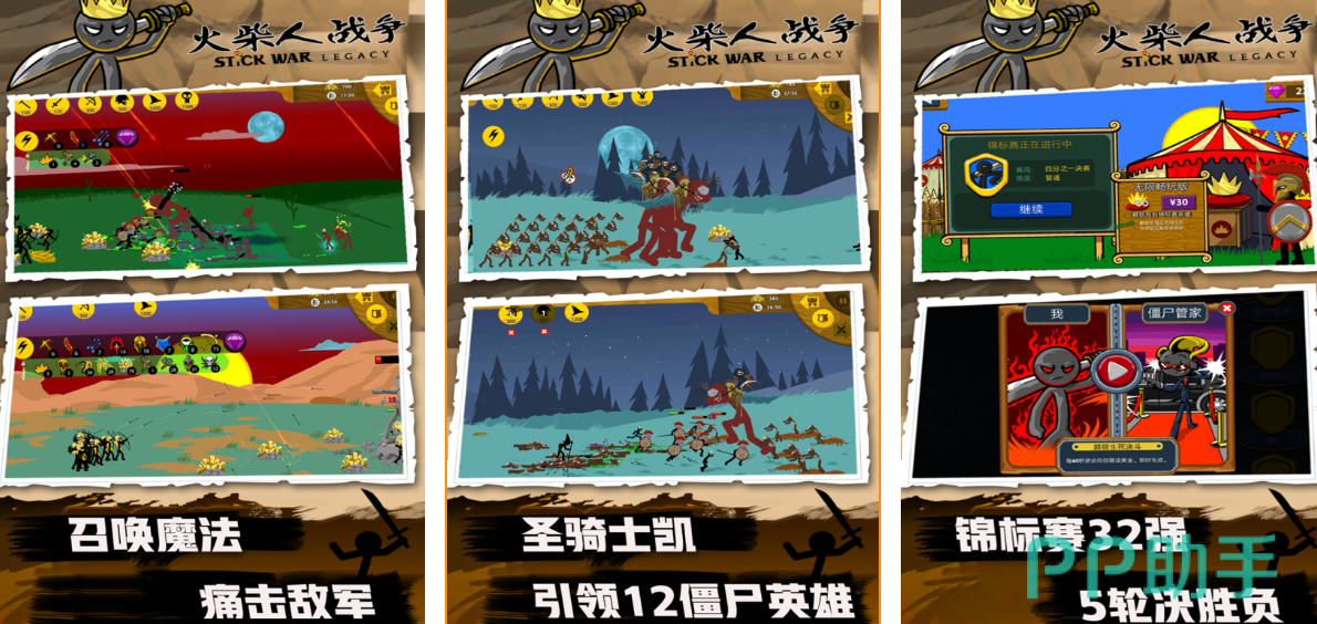 《火柴人大战3》是一款把塔防策略和即时动作打击融合在一起的硬核单机游戏,把玩家放在一个被黑暗势力入侵的火柴人部落里,任务就是构筑防线并率领精锐部队抵抗潮水般汹涌而来的敌军突袭。本作的主要竞争力就是它所拥有的成熟技能树演化路线,玩家可以通过收集灵魂碎片来解锁大范围的元素魔法或者强化士兵的物理护甲。它的画面刻画十分讲究,特别是大规模军团碰撞时候的惨烈景象和断肢效果,营造出一种非常紧张的临场竞技感。
